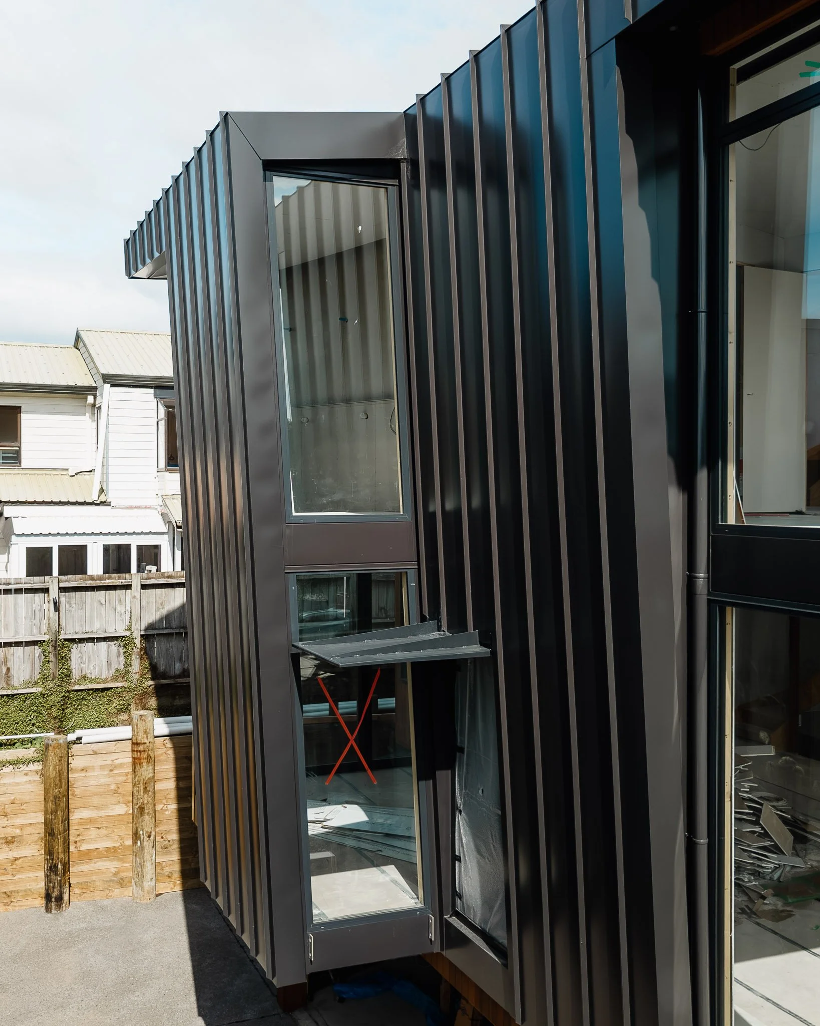 This architectural build combined roofing and cladding in a fully integrated Eurostyle Epic 525 system, using 0.55 Maxx in FlaxPod.